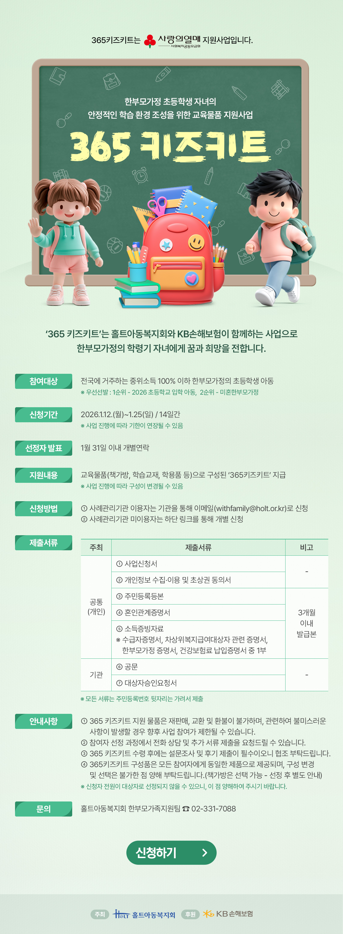 한부모가정 초등학생 자녀의 안정적인 학습환경 조성을 위한 교육물품 지원사업 '365키즈키트'